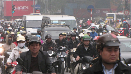| Cảnh dòng người chen chúc chờ đèn giao thông tại nút giao giữa đường Kim Liên mới và Phạm Ngọc Thạch. |