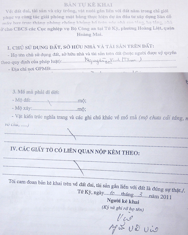 Ngày 13-3, UBND phường Hoàng Liệt nhận được đơn của sáu hộ dân, kiến nghị việc đơn vị thi công “san lấp làm mất và biến dạng mộ”, trong đó có hộ nhà ông Nguyễn Văn Vinh (51 tuổi). Tuy nhiên, theo ông Trường, đơn này có mâu thuẫn khi tại Bản tự kê khai để GPMB ngày 10-3-2011, ông Nguyễn Văn Vinh chỉ khai nhận rằng đây là đất nông nghiệp nhận theo NĐ64 – CP và dùng vào mục đích chuyên canh rau muống. Ngoài ra các tài sản trên đất, mồ mả phải di dời đều không có.