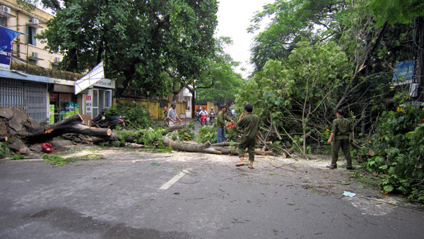 Một cây cổ thụ có đường kính khoảng 70cm trên phố Hoàng Hoa Thám cũng bị quật ngã. Ngay trong đêm, các công nhân công ty cây xanh đã giải quyết, xử lý vụ việc.
