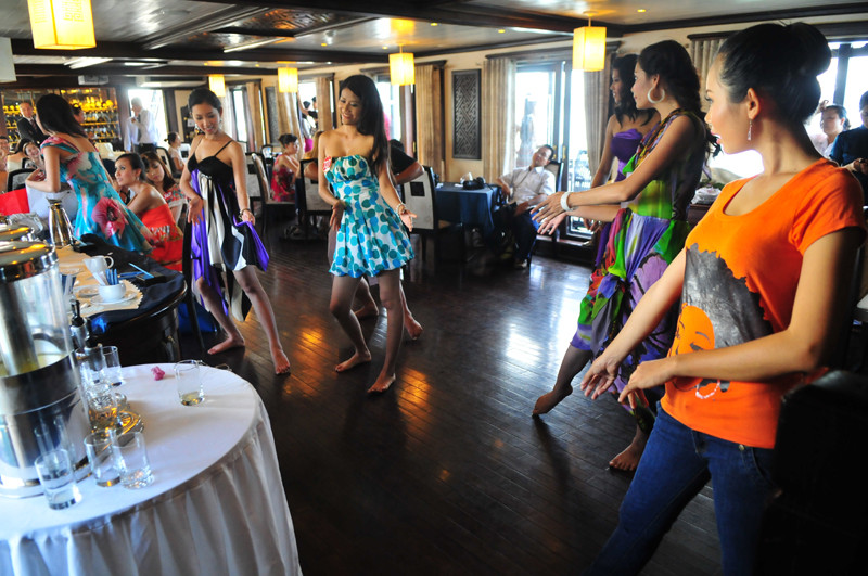 Ngay trên du thuyền trong chuyến du ngoạn Vịnh Hạ Long, các thí sinh còn tận dụng thời gian để tập các tiết mục văn nghệ sẽ trình diễn trong đêm thi Người đẹp tài năng (9 - 8).