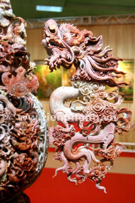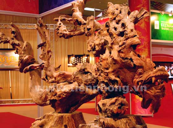 Hình ảnh rồng bay lên thể hiện ở tác phẩm “Thăng Long” làm từ lũa lim và thạch anh vàng, hồng ngọc