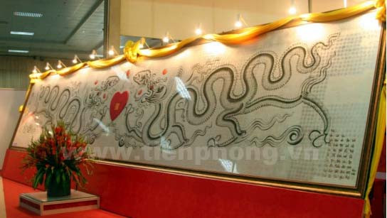 Rồng trên tác phẩm “Quốc bình Thăng Long” có kích thước (cao, dài, rộng) 73 x 63 x 23cm vànặng 28 kg