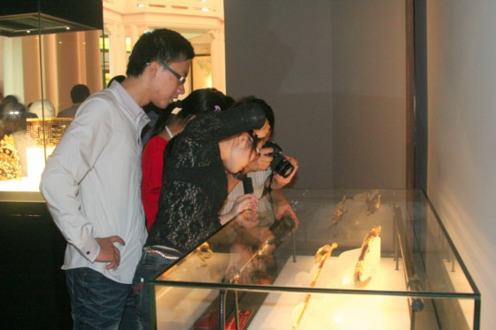 Trong không gian của triển lãm, 13 bảo vật có chất liệu chính bằng vàng khối và ngọc quý, được chọn ra từ hàng trăm bảo vật vương triều Nguyễn đang lưu giữ tại bảo tàng, đã được trưng bày thu hút hàng trăm người tới chiêm ngưỡng như: ấn vàng, kiếm vàng, sách vàng, đồ ngự dụng bằng vàng ngọc…