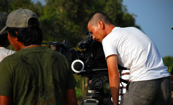 | Đạo diễn Nguyễn Phan Quang Bình (bìa trái) trong quá trình quay “Cánh đồng bất tận”. |