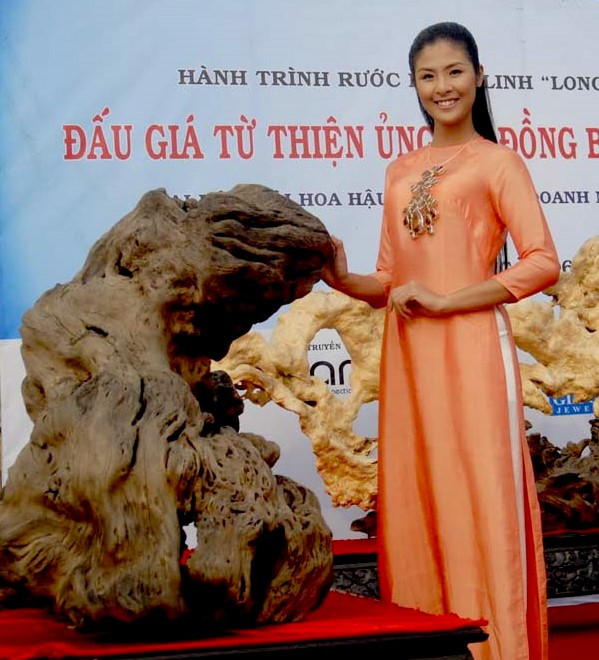 Dưới đây là hình ảnh Hoa hậu Ngọc Hân bên bộ tác phẩm gỗ lũa nghệ thuật "Tứ linh hội tụ":
