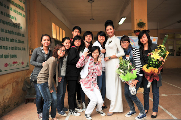 Các bạn học sinh chụp ảnh kỷ niệm cùng HH Ngọc Hân