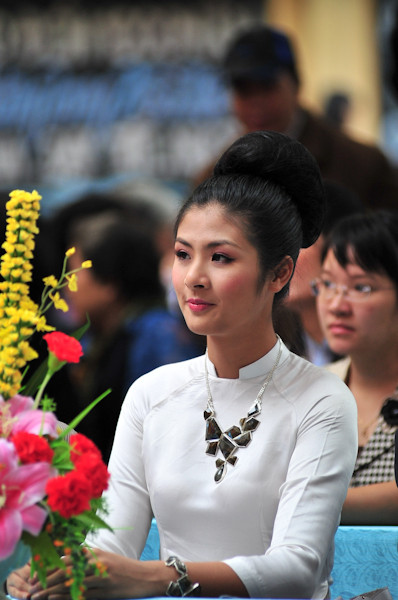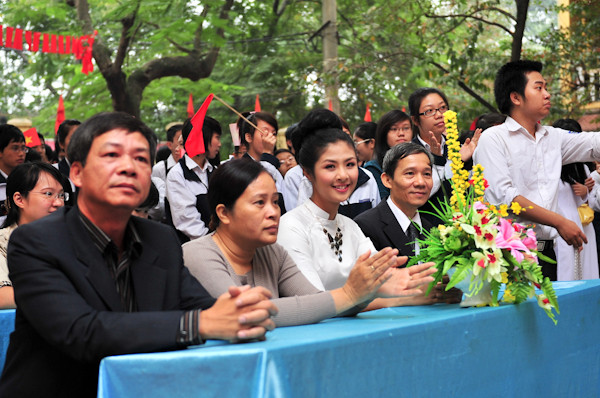 | Ngọc Hân trong vai trò Ban giám khảo cuộc thi Nữ sinh thanh lịch của trường PTTH Trần Nhân Tông. |