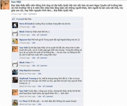 Nhưng khi thấy cô ấy ứng cử Đại Biểu Quốc Hội thì tôi không thể im lặng. Vì thế tôi đã lên trang nhật ký cá nhân của tôi đễ chia sẻ suy nghĩ với bạn bè, như những bàn luận hết sức riêng tư, chứ tôi không "phơi bày" ở đâu cả. Đó là một câu nói được viết trên status (mục chia sẻ suy nghĩ, cảm xúc của chủ nhân), chứ không phải là một entry (bài viết) như các trang mạng đề cập. Việc họ vào trang Facebook cá nhân của tôi copy những tư liệu, hình ảnh riêng tư của cá nhân tôi để đăng lên báo cũng nằm ngoài kiểm soát của tôi. Khi biết việc này tôi đã phải lập tức xóa hết status đó.
