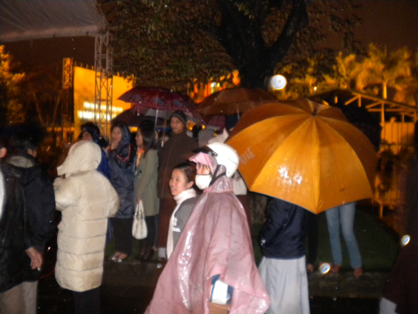 Phía bên ngoài sân khấu, hàng ngàn người không được vào sân khấu đã đội ô, đội nón, áo mưa xem các nghệ sĩ, ca sĩ biểu diễn qua 2 bên màn ảnh rộng được bố trí bên 2 cánh gà phía trước trung tâm sân khấu.