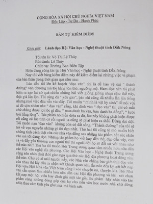 | Trích đoạn bản tự kiểm điểm Lê Thủy viết ngày 24-4 Kính gửi: Lãnh đạo Hội văn học - Nghệ thuật tỉnh Đăk Nông Tôi tên là Võ Thị Lệ Thủy Bút danh : Lê Thủy Chức vụ: Trưởng Ban Biên Tập Hiện đang công tác tại Hội Văn học – Nghệ thuật tỉnh Đăk Nông Nay tôi viết bảng kiểm điểm này để kiểm điểm lại những việc vi phạm của bản thân trong thời gian qua như sau: Lúc đầu tôi lên kế hoạch “đạo văn” chỉ là để bảo vệ cái “thánh đường” văn chương mà tôi hằng tôn thờ, ngưỡng mộ. Ham đọc nên tôi phát hiện ra sao lại quá nhiều những bài viết quá giông giống nhau như thế này, thật giả lẫn lộn. Tôi cũng đã “kêu gào”, báo chí cũng đã nhiều lần lên tiếng nhưng mọi việc đâu vẫn vào đấy. Tôi muốn “mình là vật hy sinh” để nói với ai đó còn nhăm nhe “đạo văn” rằng, khi dính vào “đạo văn” thì chỉ có mất chứ chẳng được lợi lộc gì đâu, “mua danh ba vạn, bán danh ba đồng”, “lưới trời lồng lộng”.