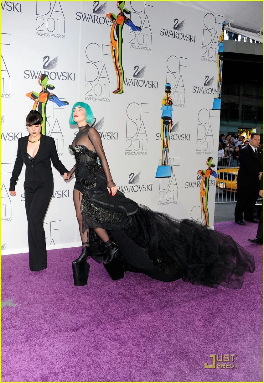 Ngay từ khi mới xuất hiện trên thảm đỏ, Lady Gaga đã thu hút mọi ống kính với mái tóc được nhuộm xanh lạ mắt, bộ váy đen có phần trên mỏng manh làm lộ vòng một căng tròn trong khi phần đuôi váy lại lòa xòa như một nàng chim hoang dã.
