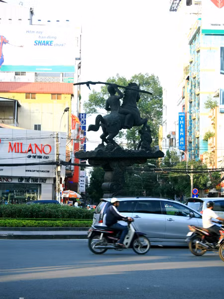 Tượng đài Thánh Gióng (cuối ngã sáu Cách Mạng Tháng Tám) dù khá nhỏ, không phù hợp với tầm vóc của nhân vật, nhưng khối hình thù ấy vẫn đủ làm tối sầm một góc đường, giữa khung cảnh nhộn nhạo của một đoạn đường đông đúc. (ảnh 2: chụp chiều 9-8)