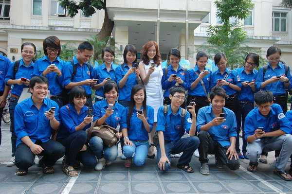 | Lý Nhã Kỳ cùng các bạn sinh viên nhắn tin bình chọn Vịnh Hạ Long. |