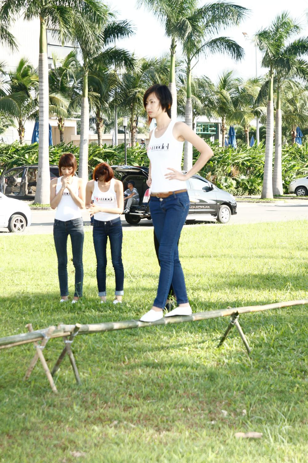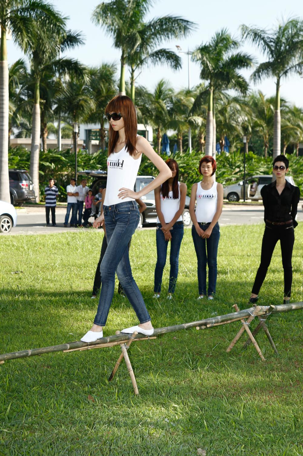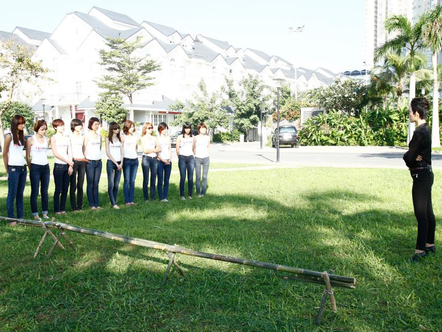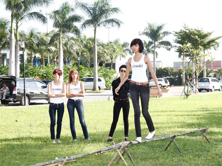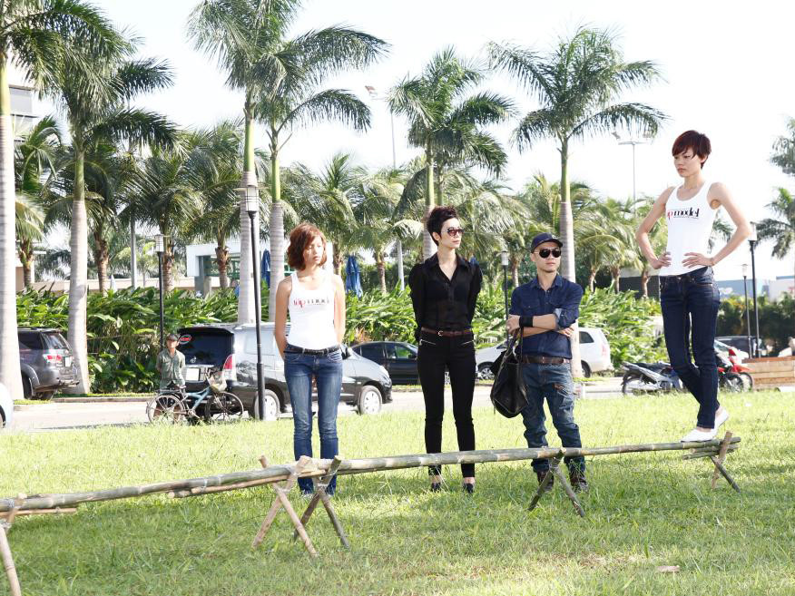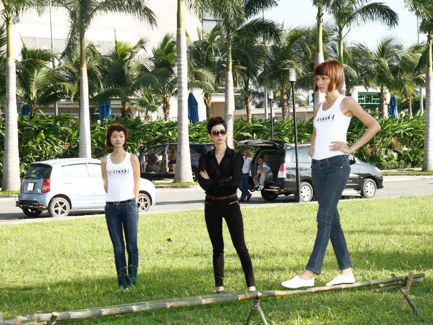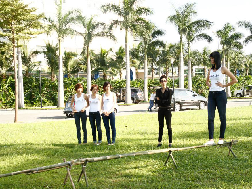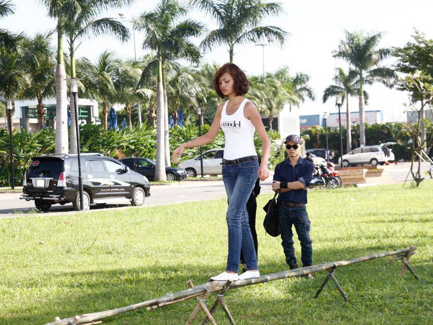 Với một chiếc cầu tre được thực hiện trên nền sân cỏ của Sài Gòn Pearl, các thí sinh phải có khả năng giữ thăng bằng tốt thì mới có thể di chuyển suôn sẻ chứ chưa nói đến việc tạo dáng thật đẹp khi đi trên địa hình này.