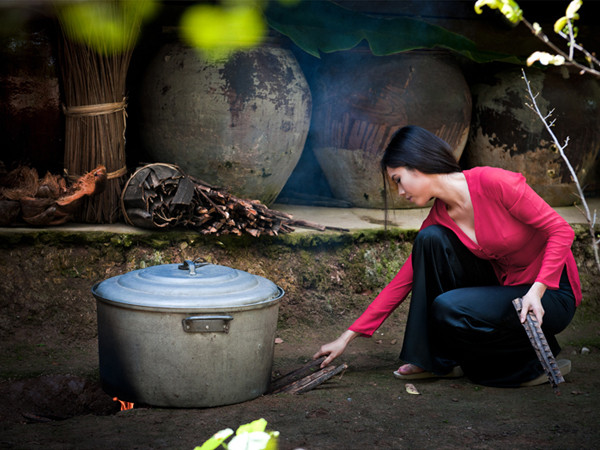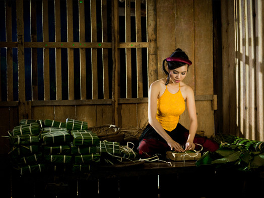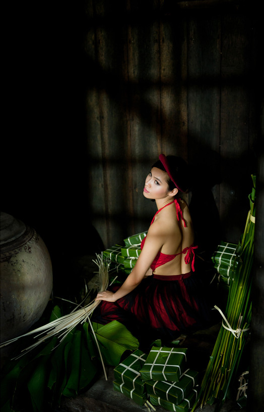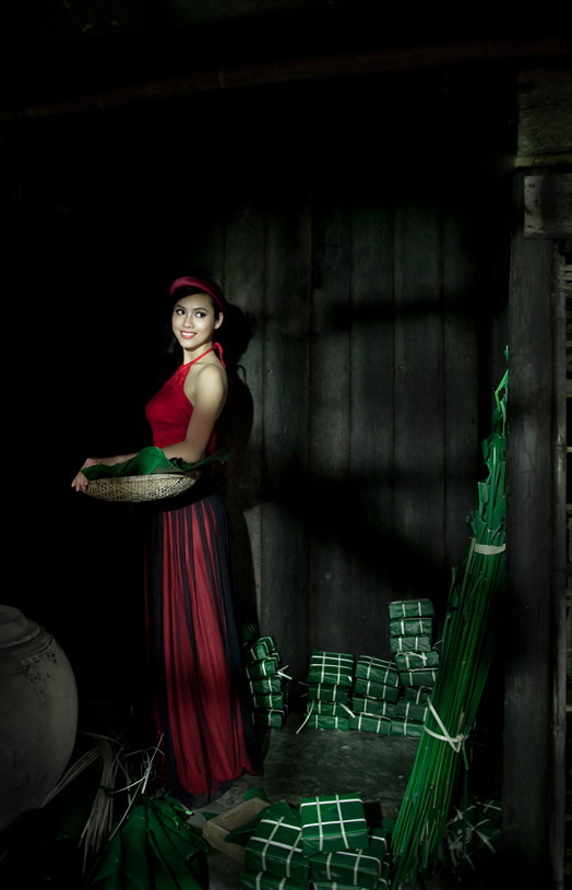 Nhân dịp tết Nhâm Thìn, Hoàng My cùng ê-kíp của mình đã quyết định thực hiện một bộ ảnh độc đáo để người đẹp hoá thân thành cô gái xứ Bắc nấu bánh chưng và cô gái miền Nam nấu bánh tét chuẩn bị chào đón năm mới.