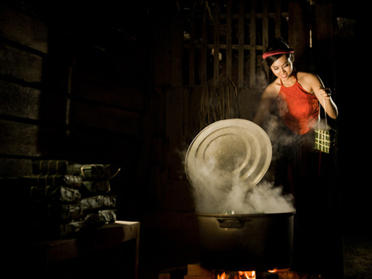 Bộ ảnh độc đáo "cô rồng" Hoàng My mặc áo yếm gợi cảm nấu bánh chưng, bánh tét: