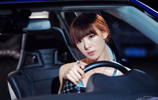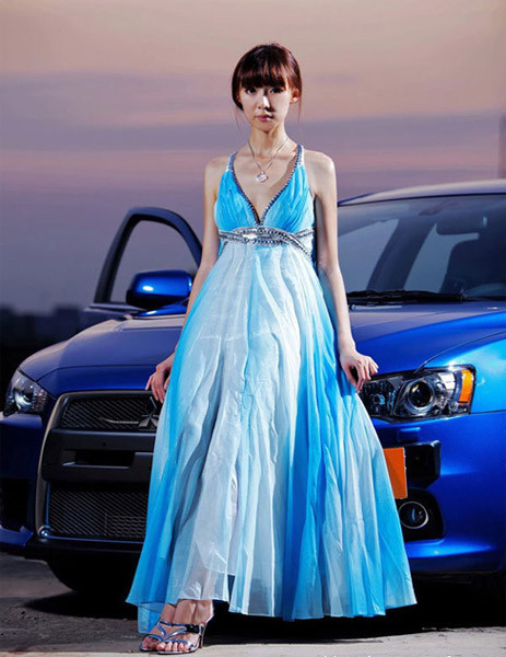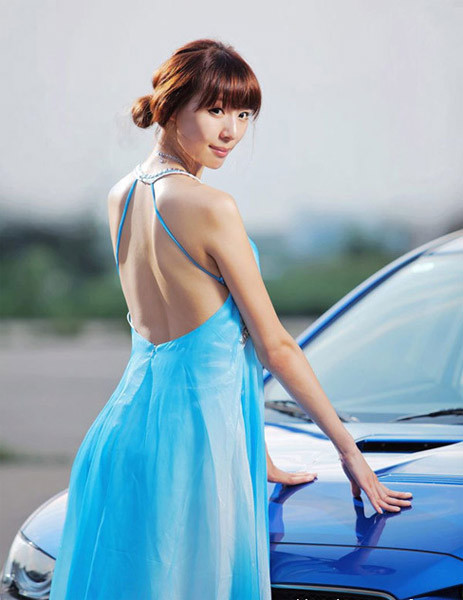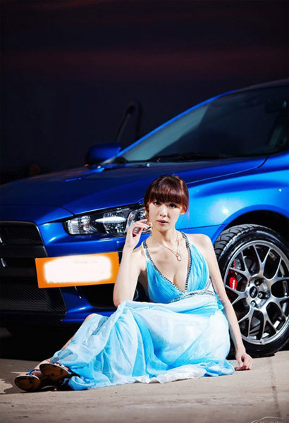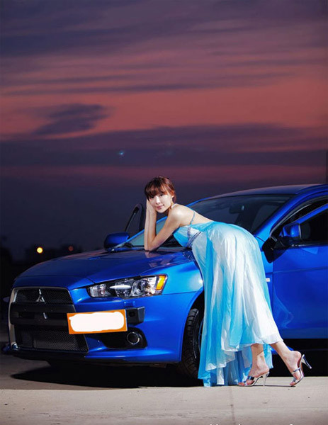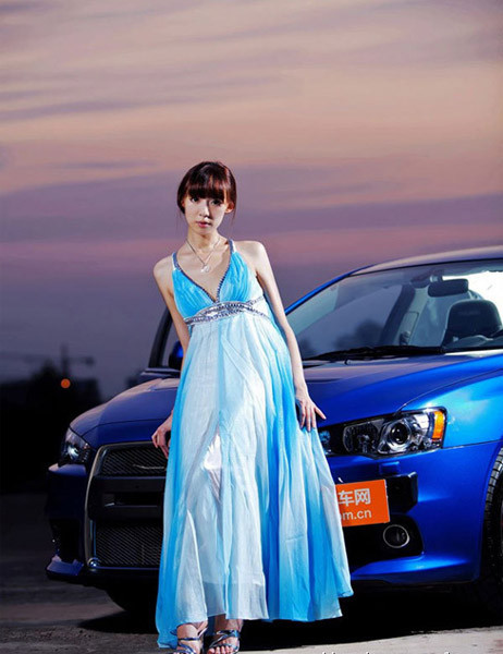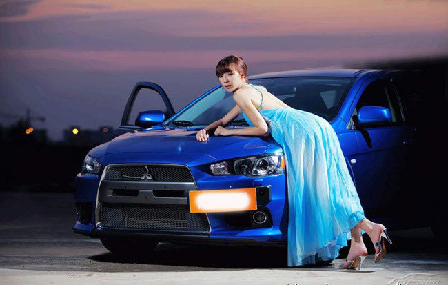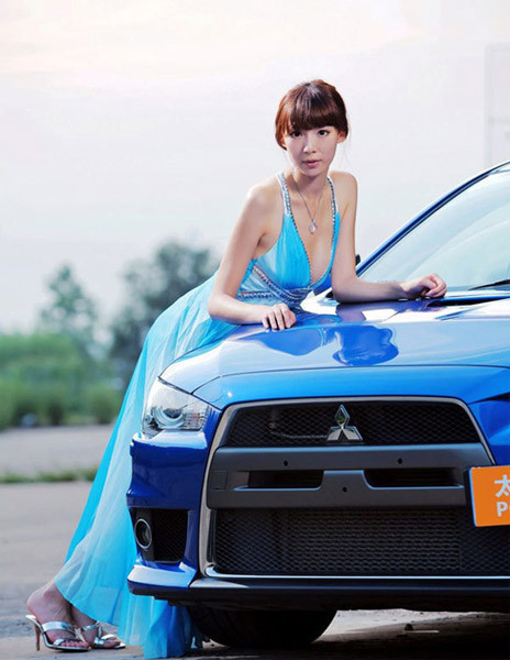 Chiếc váy và xe Mitsubishi cùng tông màu xanh tạo cảm giác thật mát mắt cho người ngắm.