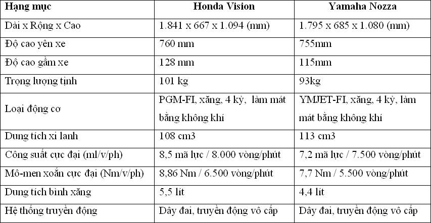 Thông số kỹ thuật Honda Vision và Yamaha Nozza: