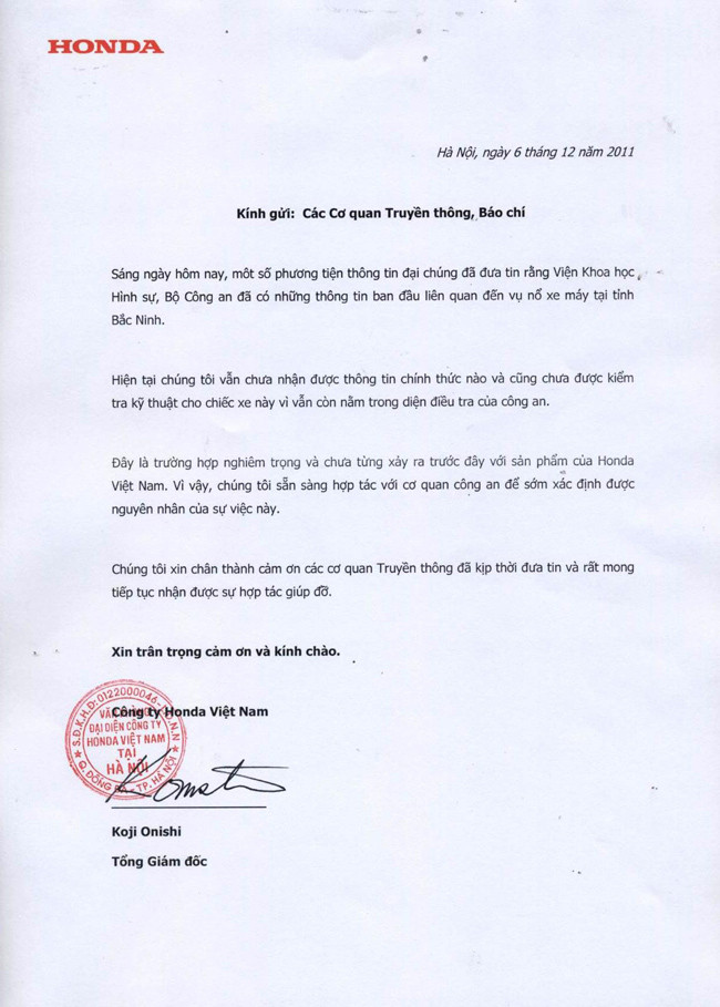 Tuy nhiên, Honda Việt Nam lại đưa ra thông cáo báo chí, khẳng định hãng chưa nhận được bất kỳ một văn bản nào liên quan tới kết quả điều tra của Viện Khoa học Hình sự, Bộ Công An về vụ việc trên.