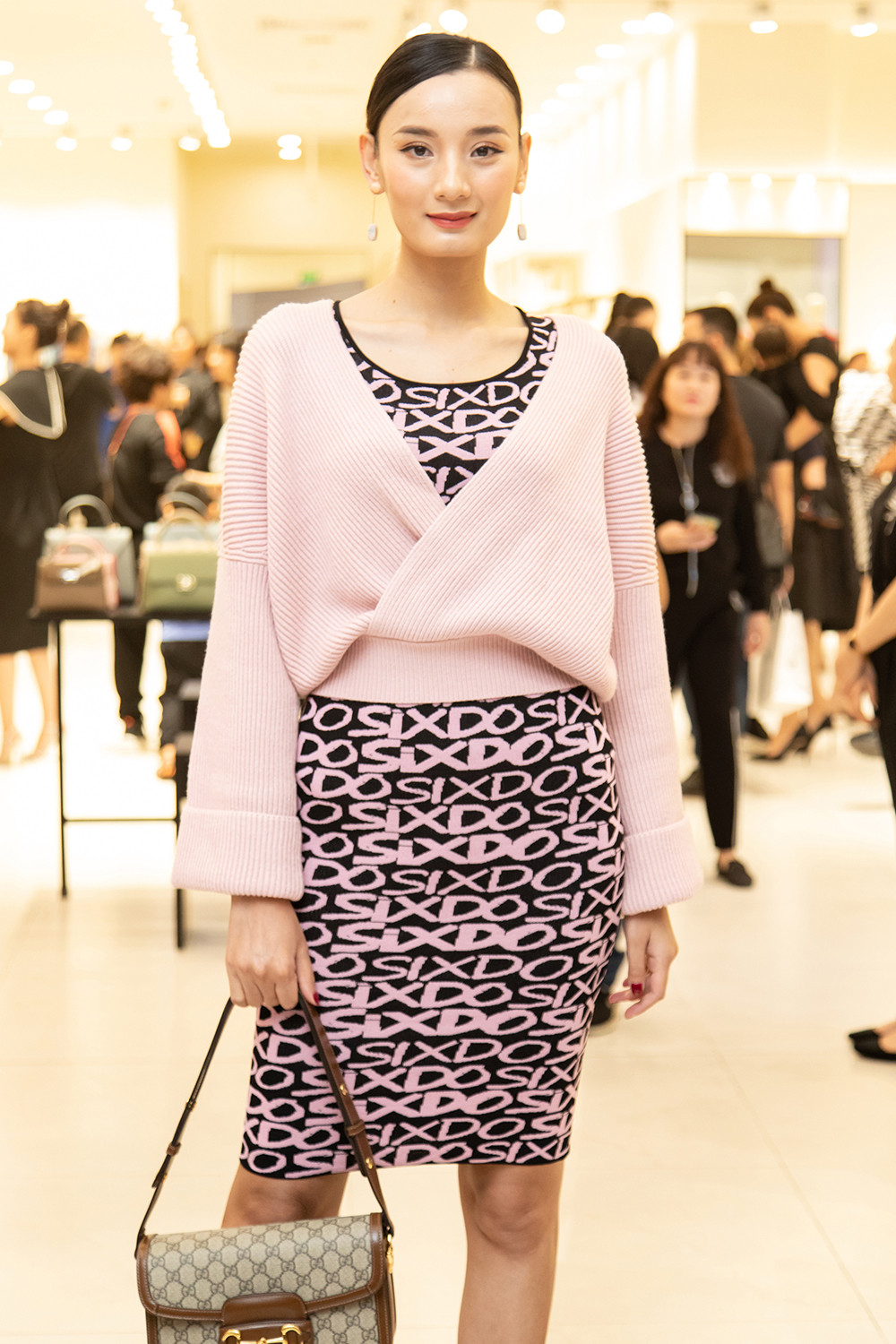 Lê Thuý mang đến vẻ ngoài ngọt ngào với áo khoác phối cùng váy ôm hoạ tiết với chất liệu dệt kim.