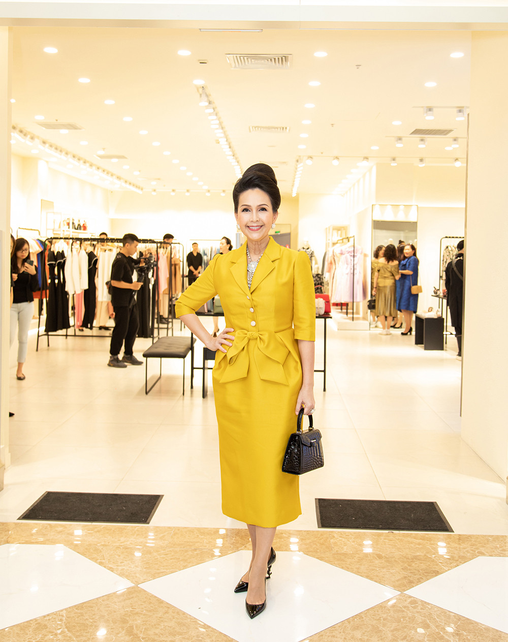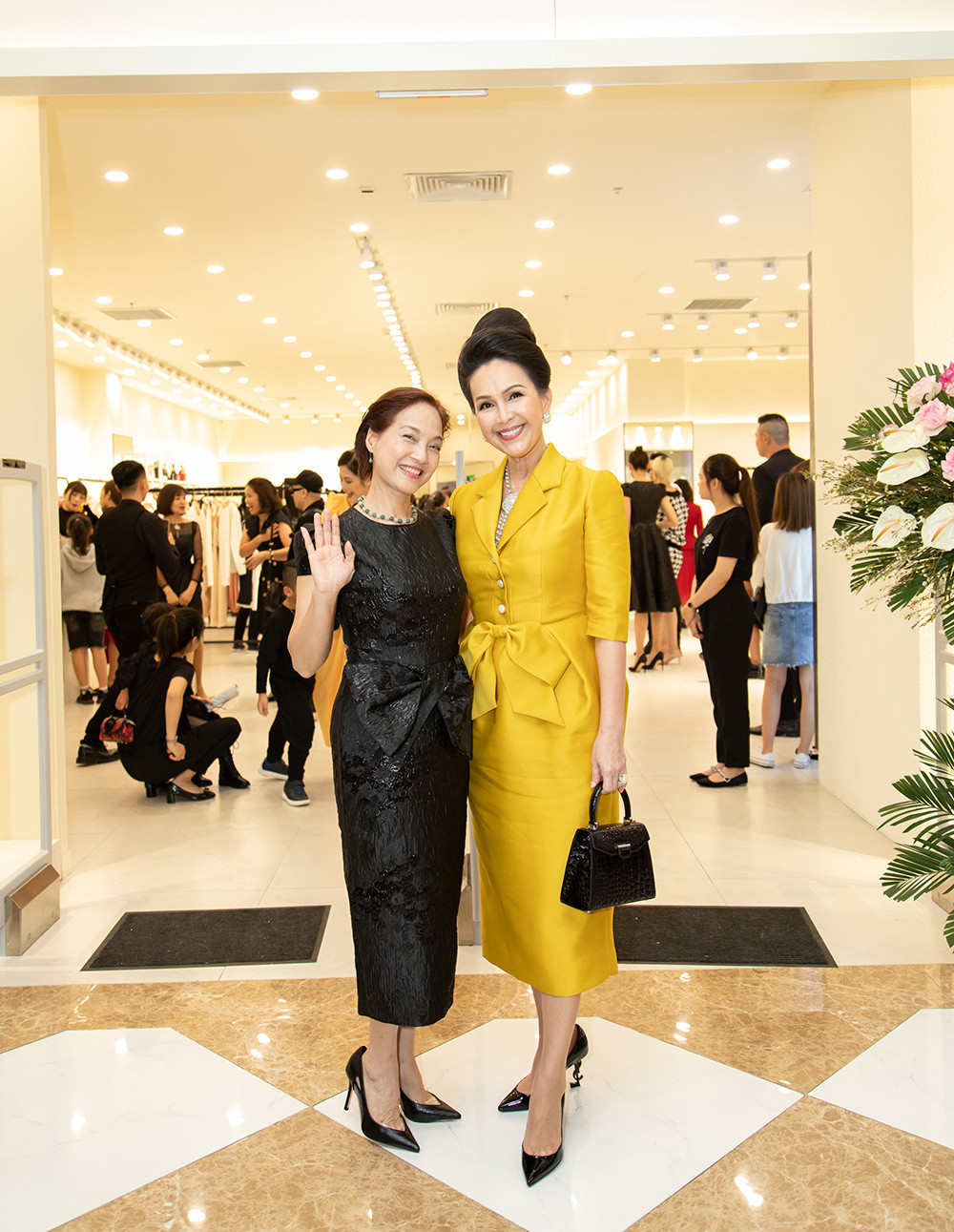 Diễm My hội ngộ NSND Lan Khanh. NSND Lan Khanh chọn diện chiếc váy màu đen với chất liệu gấm với hoạ tiết in chìm dập nổi. Thiết kế có phần nơ to bản làm điểm nhấn.