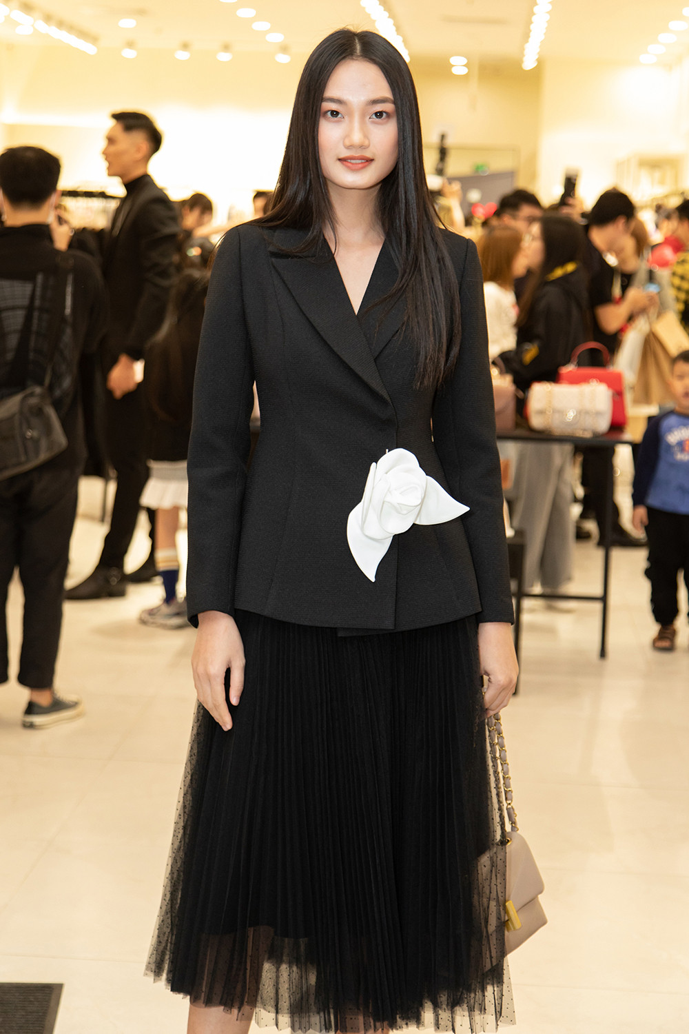 Người mẫu Quỳnh Anh duyên dáng với vest đen nhấn hoa trắng mặc cùng chân váy xếp li.