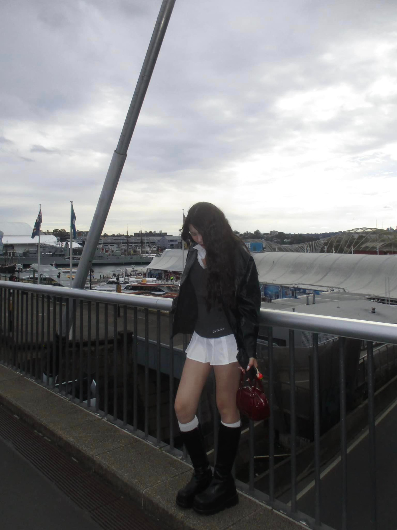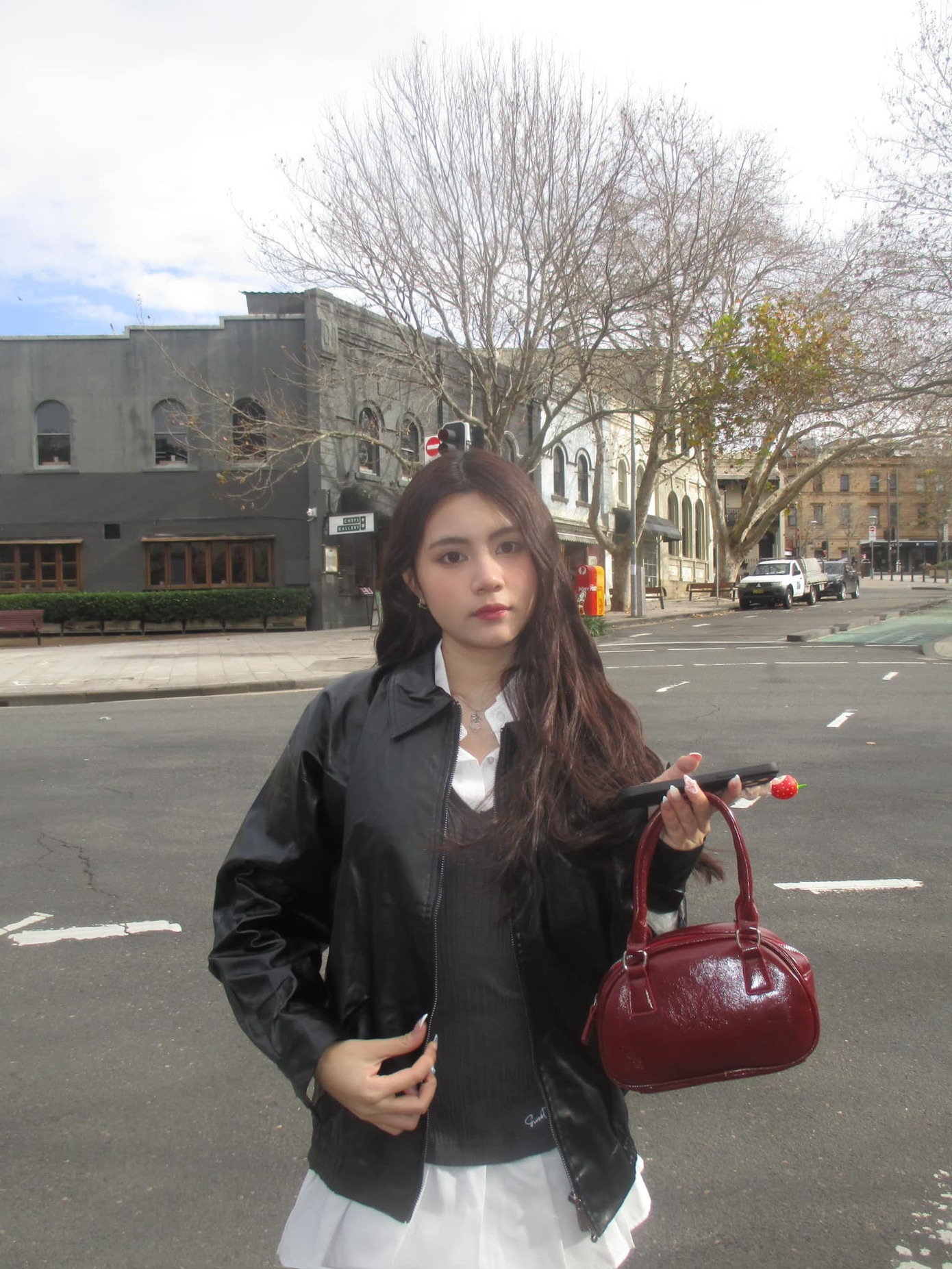Trong khi đó, Hạt Dẻ ghi điểm với những tạo hình thời thượng. Các mẫu váy ngắn được cô bạn ưa chuộng để khoe khéo đôi chân dài thẳng tắp. Hạt Dẻ đem đến diện mạo cá tính khi phối chân váy xếp ly với bốt da cao cổ, tất trắng cùng tông váy. Túi xách da đỏ hot trend trở thành điểm nhấn. Kiểu phối phụ kiện tông đỏ này là xu hướng thời trang thịnh hành suốt thời gian qua.