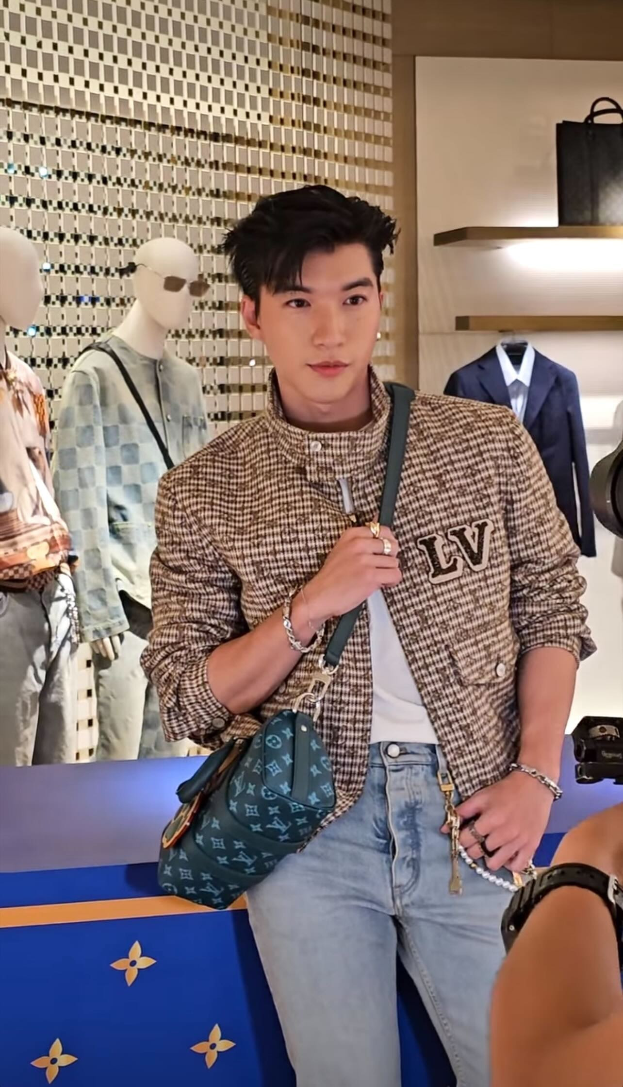 "Công tử Bạc Liêu" Song Luân có lựa chọn an toàn. Bộ âu phục trơn đen được nam diễn viên phối cùng túi xách monogram.