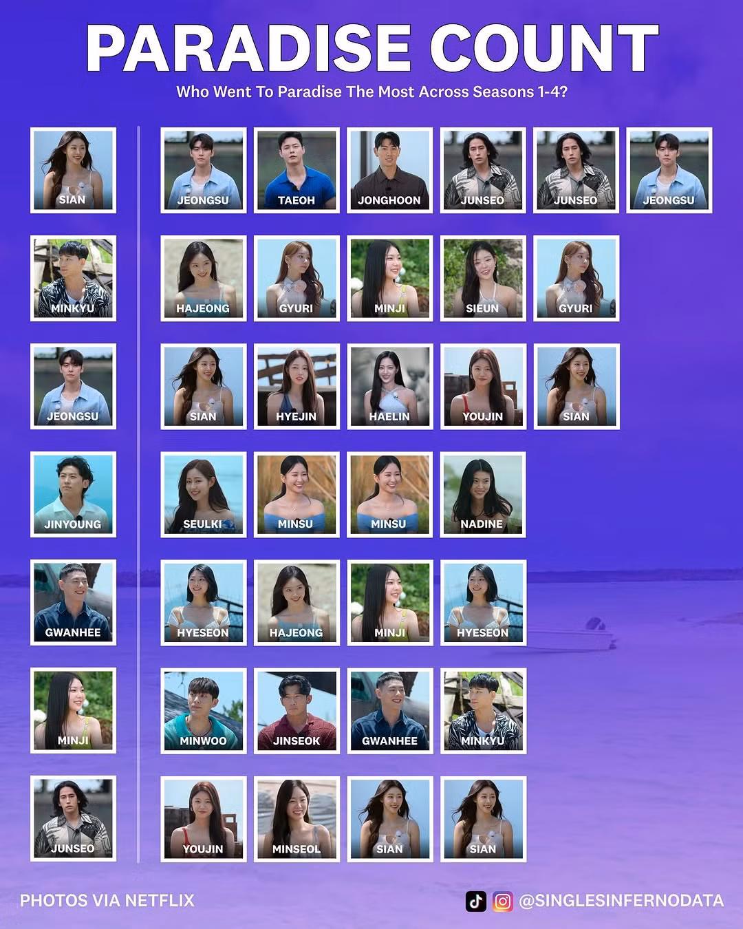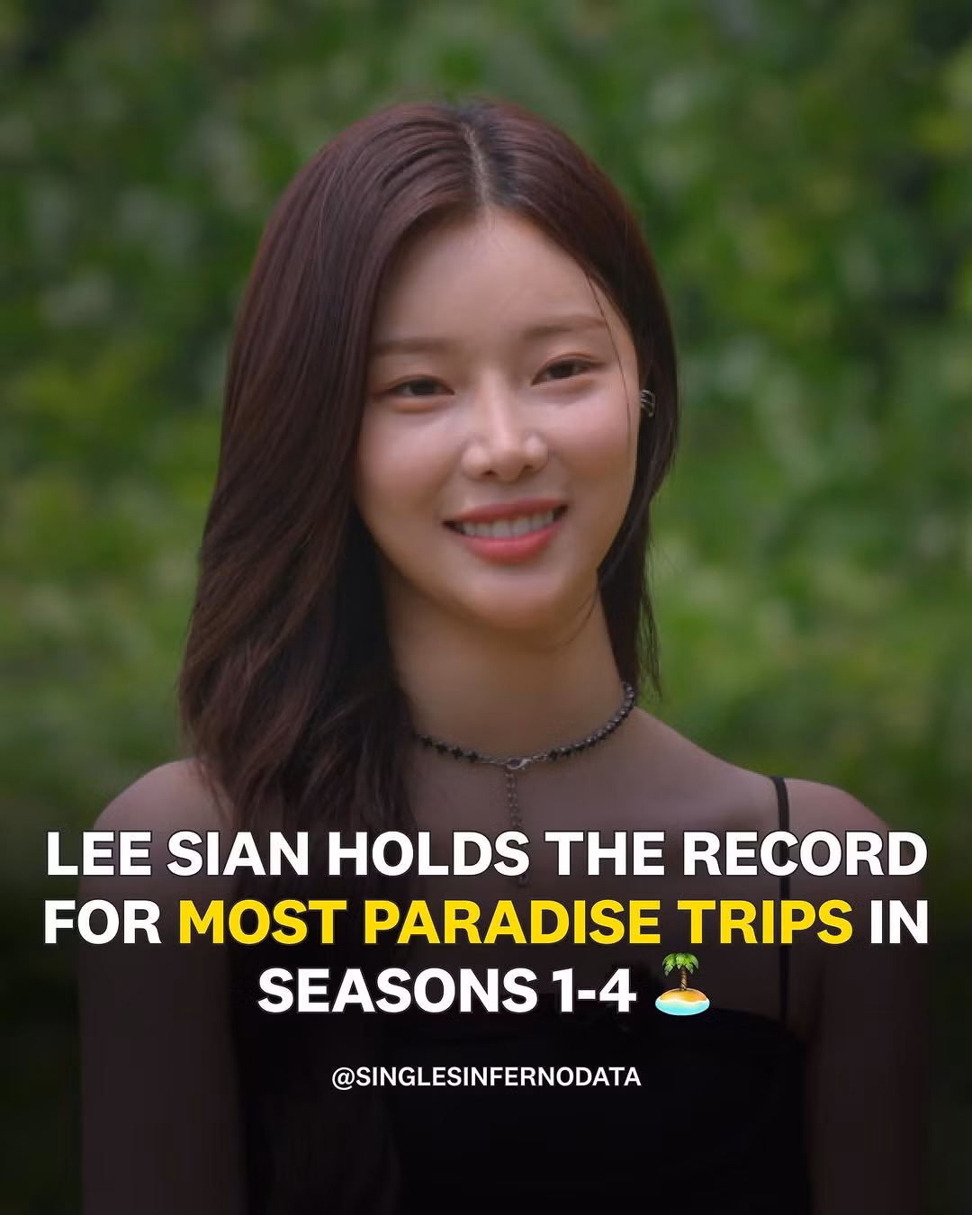 Số lần đi hẹn hò trên Đảo Thiên Đường của Lee Si An không chỉ dẫn đầu dàn cast mùa 4 mà còn phá vỡ kỷ lục suốt 4 mùa phát sóng của Địa Ngục Độc Thân. Ở vị trí số 2 trong bảng xếp hạng này là Jeong Su (mùa 4) và Min Kyu (mùa 3) với 5 lần tới Đảo Thiên Đường.