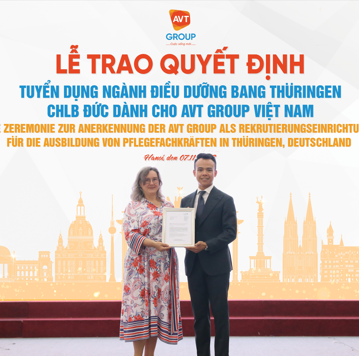 Trong buổi ghé thăm và làm việc, phái đoàn bang Thüringen đã cùng AVT trao đổi các vấn đề liên quan đến cơ hội học tập và việc làm cho học viên Việt Nam tại Thüringen nói riêng và tại Đức nói chung. Đại diện bang Thüringen – bà Heike Werner đã trao chứng nhận công nhận AVT Group chính thức trở thành đơn vị tuyển dụng du học sinh nghề điều dưỡng cho bang. Phái đoàn cũng giao lưu, trò chuyện với hơn 300 học viên tại hội trường lớn trường Cao đẳng Xây dựng số 1, Trung Văn, Nam Từ Liêm, Hà Nội.