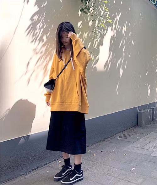 Áo trùm bên ngoài chân váy giúp che giấu hoàn toàn nhược điểm cơ thể, dù bạn có "mũm mĩm" một chút cũng không sao. Kết hợp cùng các kiểu giày thể thao, con gái trông thêm phần năng động, trẻ trung.