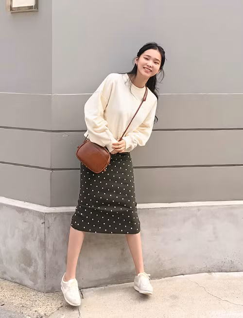 Các kiểu chân váy bút chì họa tiết mix cùng áo nỉ màu sắc trung tính mang đến diện mạo chuẩn gái Hàn.