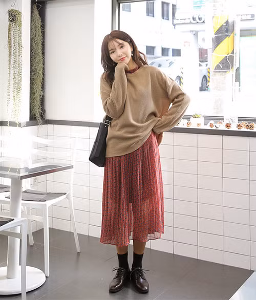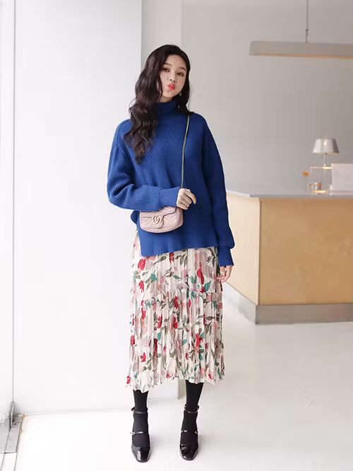 Lưu ý khi mặc áo len trơn màu, bạn có thể diện chân váy hoa làm điểm nhấn và ngược lại, áo len có họa tiết nên được kết hợp cùng chân váy trơn.