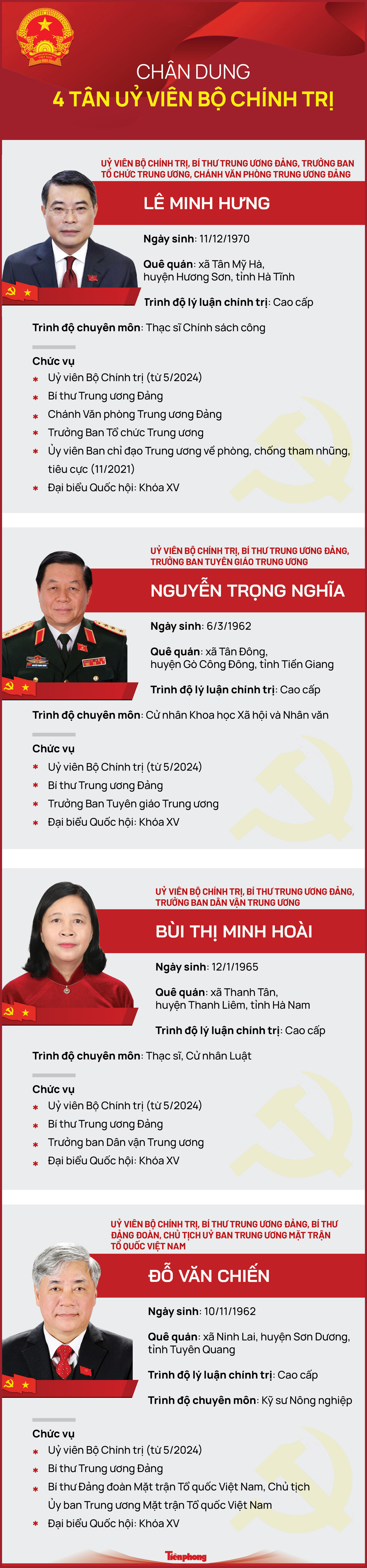 | Các ông, bà được bầu bổ sung vào Bộ Chính trị khoá XIII (từ trái qua): Nguyễn Trọng Nghĩa, Bùi Thị Minh Hoài, Lê Minh Hưng, Đỗ Văn Chiến. Ảnh: Tạ Trang. |
