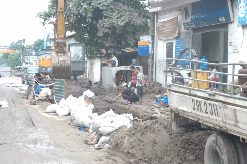 Đường ống dẫn nước được chôn sâu dưới đường Lĩnh Nam, sát khu vực đang thi công lắp đặt đường cống thoát nước dọc đường Lĩnh Nam. Điểm vỡ trên ống dẫn nước sạch dài khoảng 40cm. Nước từ đây tràn ra liên tục, các máy bơm phải mất nhiều thời gian hút nước khỏi hố công trình này để các công nhân tiếp cận điểm vỡ.