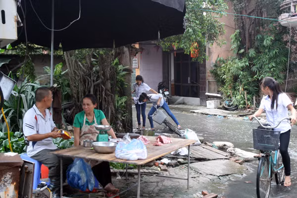 | Đi lại bằng ủng vì nước thường xuyên ngập. |