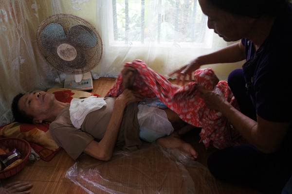 Đến xóm 1 (xã Vũ Đoài, Vũ Thư, Thái Bình), trong cơn mưa rả rích, vào căn nhà nhỏ của ông Nguyễn Văn Phúc (SN 1945), cựu Thanh niên xung phong (TNXP) nằm liệt giường từ 8 năm đang chờ chết mà chúng tôi không khỏi rớm nước mắt.