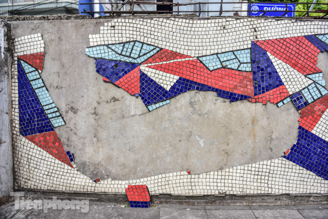 Mảng tranh lớn bị bong tróc lộ ra mảng tường lớn.