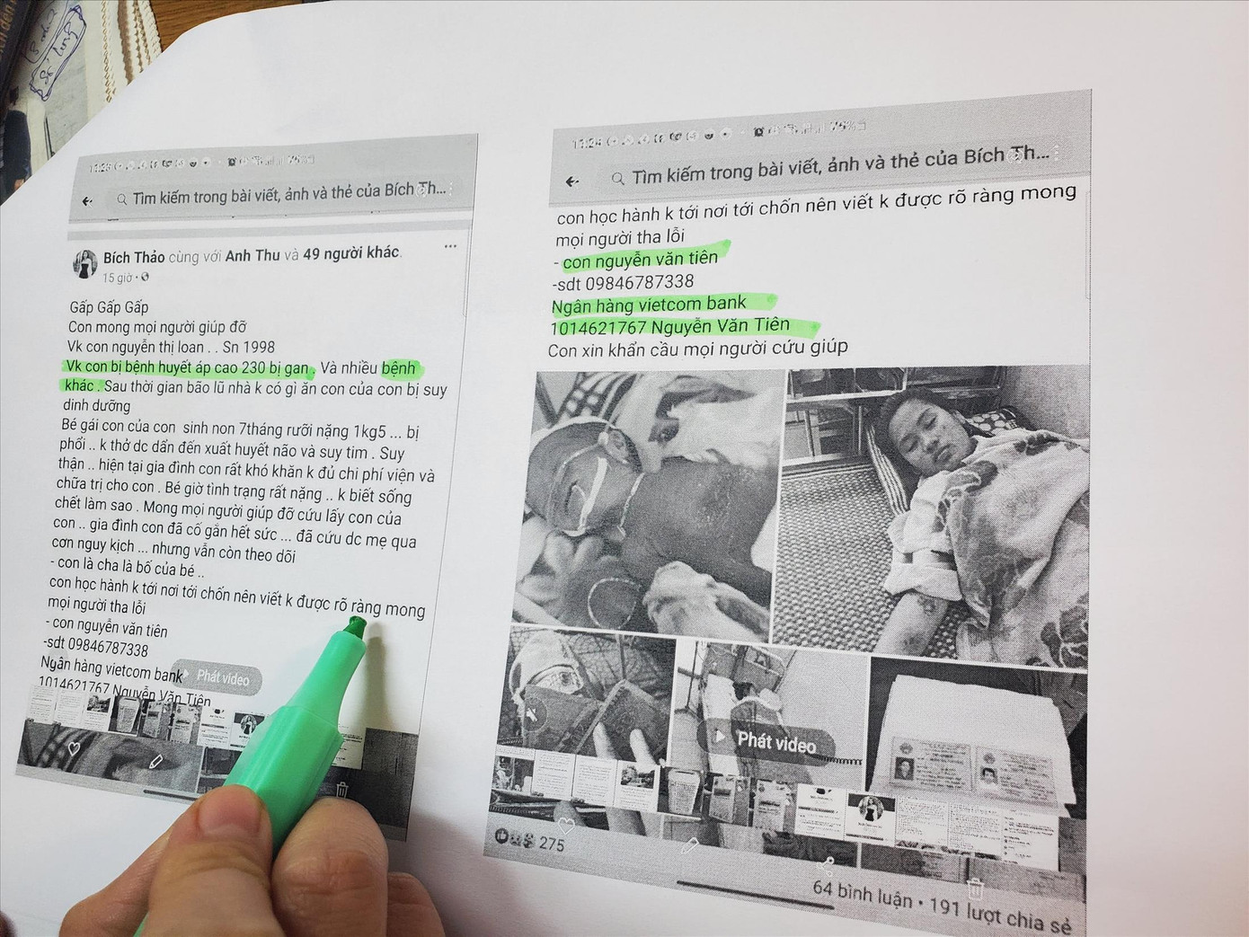 Qua theo dõi nắm bắt, tài khoản này cho thấy nhiều thông tin trên các bài đăng có dấu hiệu trục lợi. Chẳng hạn, trường hợp bé gái sinh non nặng 1,5 kg bị bệnh phổi, không thở được, dẫn đến xuất huyết não và suy tim được tài khoản này kêu gọi gửi tiền vào tài khoản của “bố” bệnh nhi này là Nguyễn Văn Tiên, số tài khoản: 10XXXXX67, mở tại Ngân hàng Vietcombank.