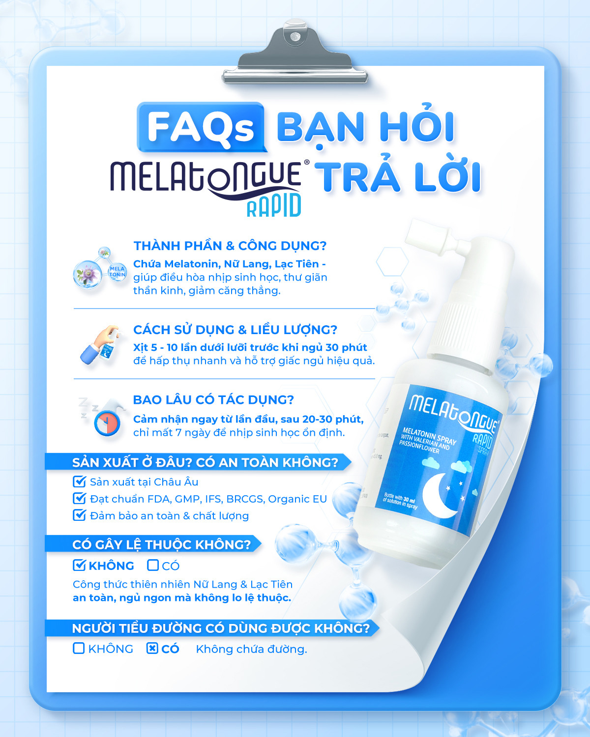 Theo đại diện nhãn hàng, Melatongue® Rapid ra đời từ sự thấu hiểu sâu sắc những thách thức mà tình trạng rối loạn giấc ngủ ngày càng phổ biến gây ra. Sản phẩm được sản xuất tại nhà máy Laboratorious Anur (Tây Ban Nha) và nhập khẩu nguyên chai, đáp ứng đầy đủ các tiêu chuẩn chất lượng của Quốc tế với công thức 100% an toàn từ Melatonin pH 4, Nữ lang, Lạc tiên cùng công nghệ xịt dưới lưỡi thế hệ mới, được nghiên cứu và phát triển bởi các chuyên gia châu Âu.