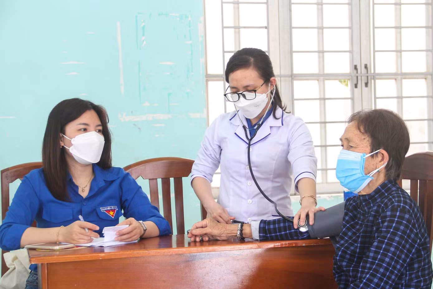 | Chị Nguyễn Thị Thúy Lam, Phó Bí thư Tỉnh đoàn Đồng Tháp thăm hỏi cụ già