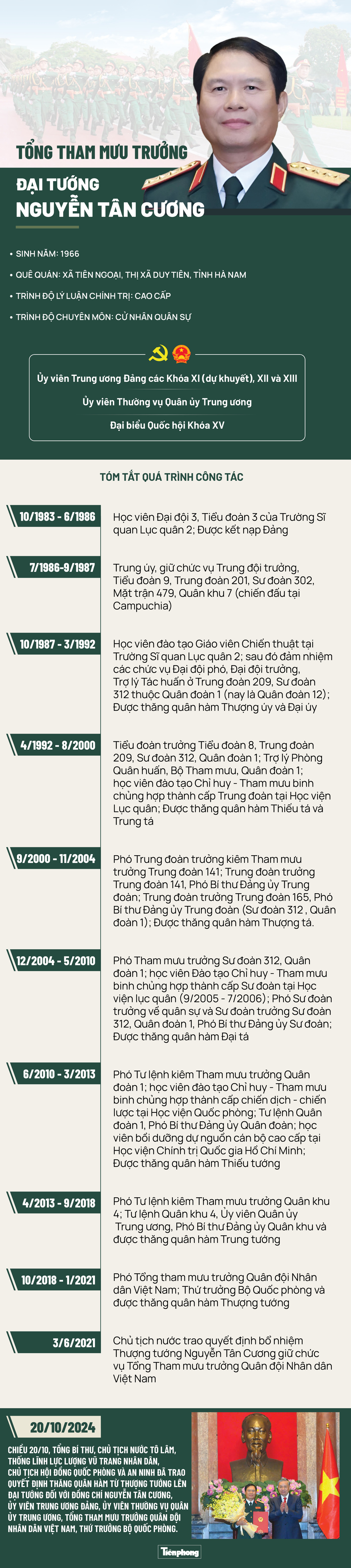 Ngày 20/10/2024, Tổng Bí thư, Chủ tịch nước Tô Lâm trao Quyết định thăng quân hàm Đại tướng đối với Tổng Tham mưu trưởng Quân đội nhân dân Việt Nam Nguyễn Tân Cương.