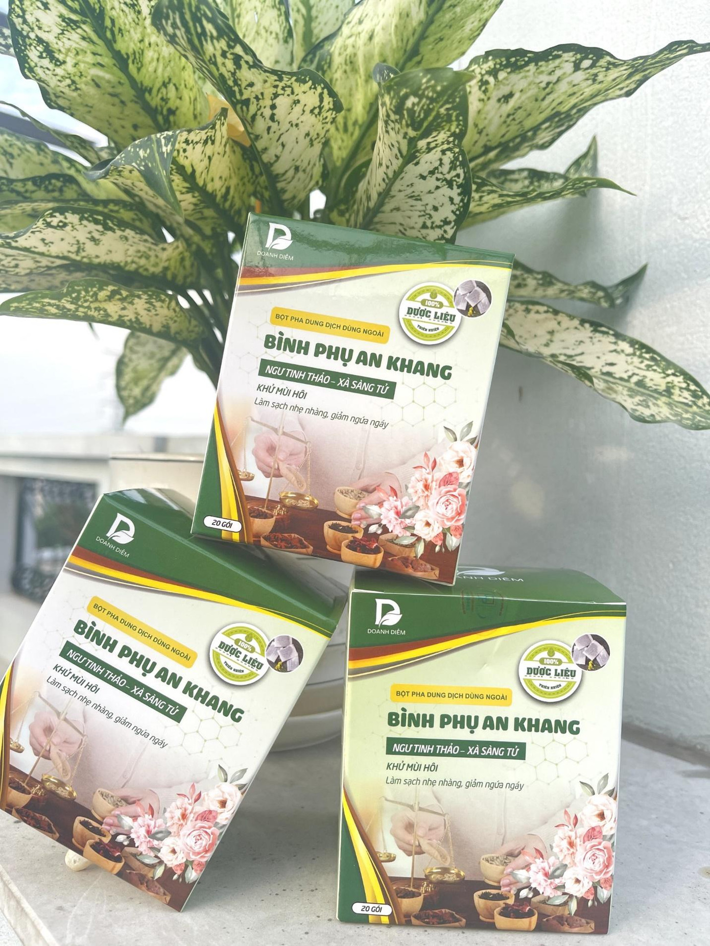 Bình Phụ An Khang được chiết xuất từ các dược liệu quý. Tuy nhiên, nổi bật nhất là thành phần Xà sàng tử. Cho đến nay, đã có hơn 350 hợp chất đã được phân lập và xác định từ cây xà sàng. Các nghiên cứu in vitro và in vivo cho thấy rằng osthole và các hợp chất coumarin khác có nhiều đặc tính dược lý để điều trị bộ phận sinh dục nữ, các bệnh liên quan đến da và có tác dụng chống ngứa, chống dị ứng, kháng khuẩn, kháng nấm mạnh. Chất chiết xuất từ xà sàng tử được chứng minh có khả năng ức chế sự sinh trưởng của tụ cầu khuẩn vàng, trực khuẩn mủ xanh, nấm microsporum, epidermophyton – nguyên nhân gây lở ngứa.