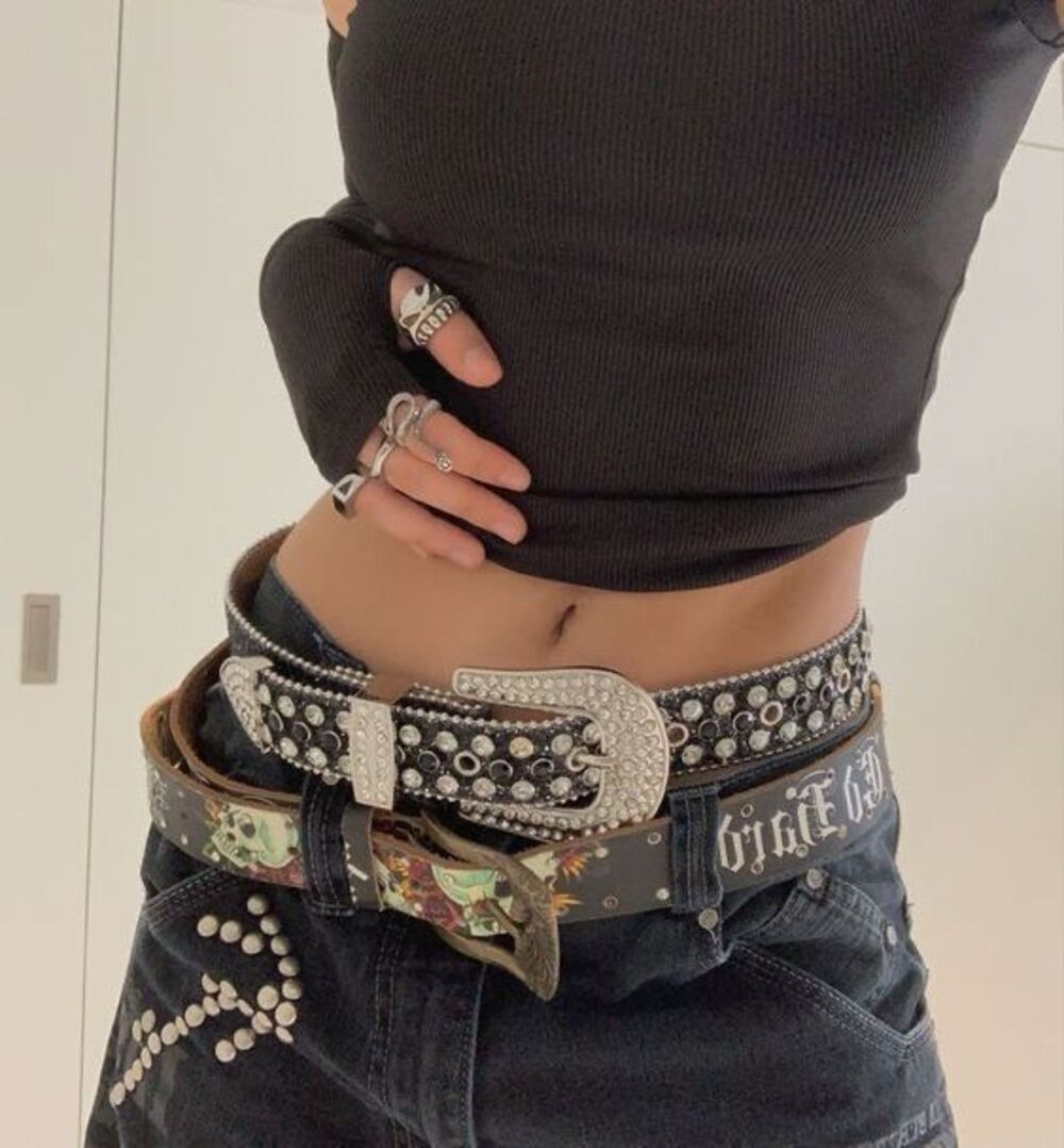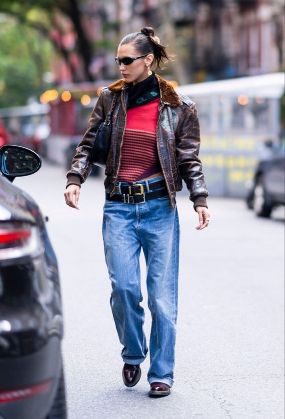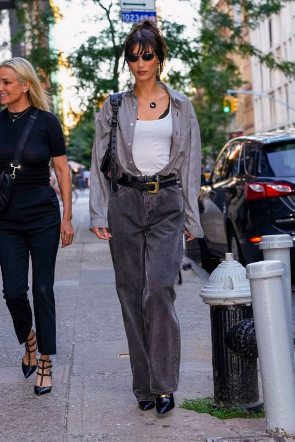 Bella Hadid nhiều lần được bắt gặp phối thắt lưng đôi dạo phố. Nữ người mẫu thường lựa chọn cặp thắt lưng cùng chất liệu, phối cùng các món đồ mang hơi hướng đường phố, bụi bặm.