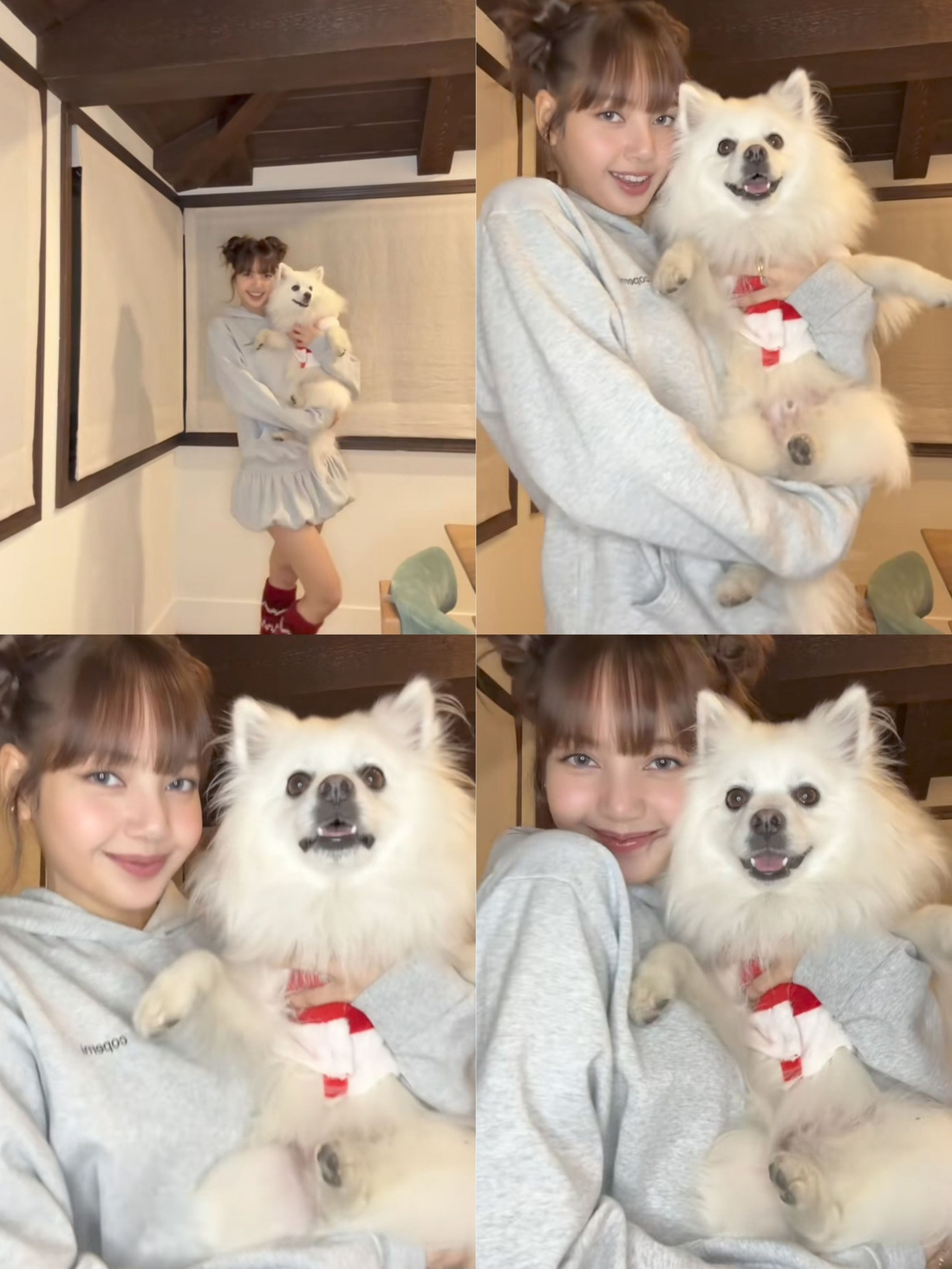 Lisa BLACKPINK gửi lời chúc mừng Giáng sinh tới người hâm mộ cùng thú cưng. Giọng ca Rockstar khoe nhan sắc ngọt ngào, sử dụng tất đỏ họa tiết "cộp mác" Noel làm điểm nhấn cho tạo hình. Cún cưng Love của cô cũng được mix & match phụ kiện đỏ đáng yêu.