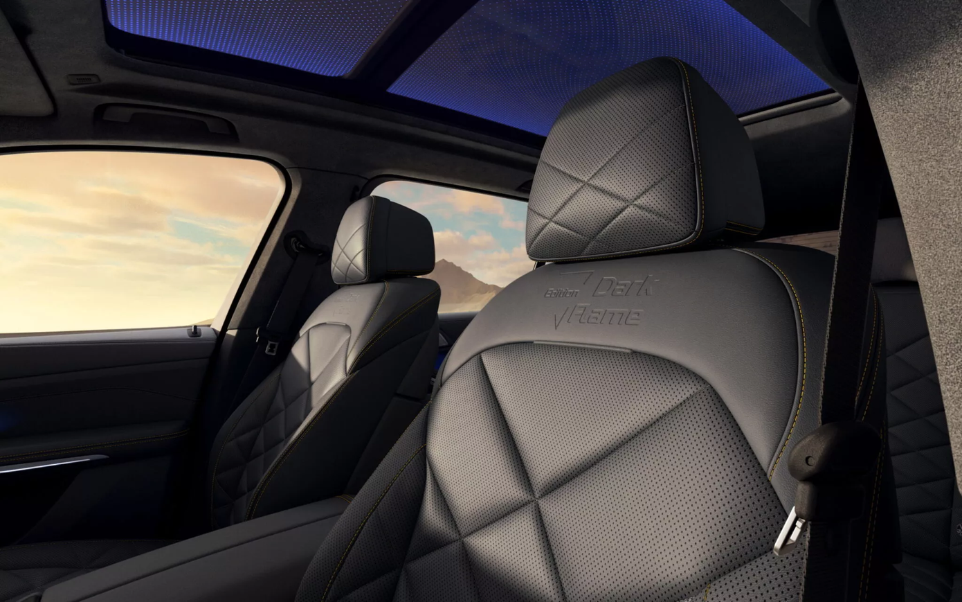 Nội thất màu tối có các đường chỉ khâu màu vàng tương phản và các chi tiết ốp sợi carbon trên bảng điều khiển và bệ trung tâm. Logo Dark Flame cũng xuất hiện trên giá đựng cốc, lưng ghế trước và bệ cửa phát sáng.
