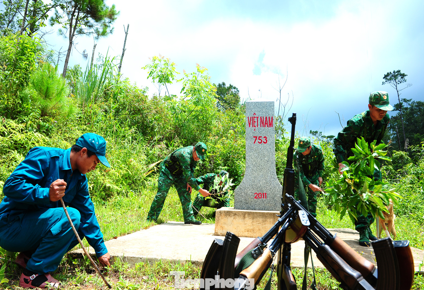 | Bộ đội Biên phòng (BĐBP) Kon Tum ngày càng được củng cố vững chắc, tích cực tham gia xây dựng cơ sở chính trị, phát triển kinh tế - xã hội trên khu vực biên giới. Trong ảnh, lực lượng biên phòng cùng các đoàn thể tham gia gìn giữ cột mốc biên giới. |