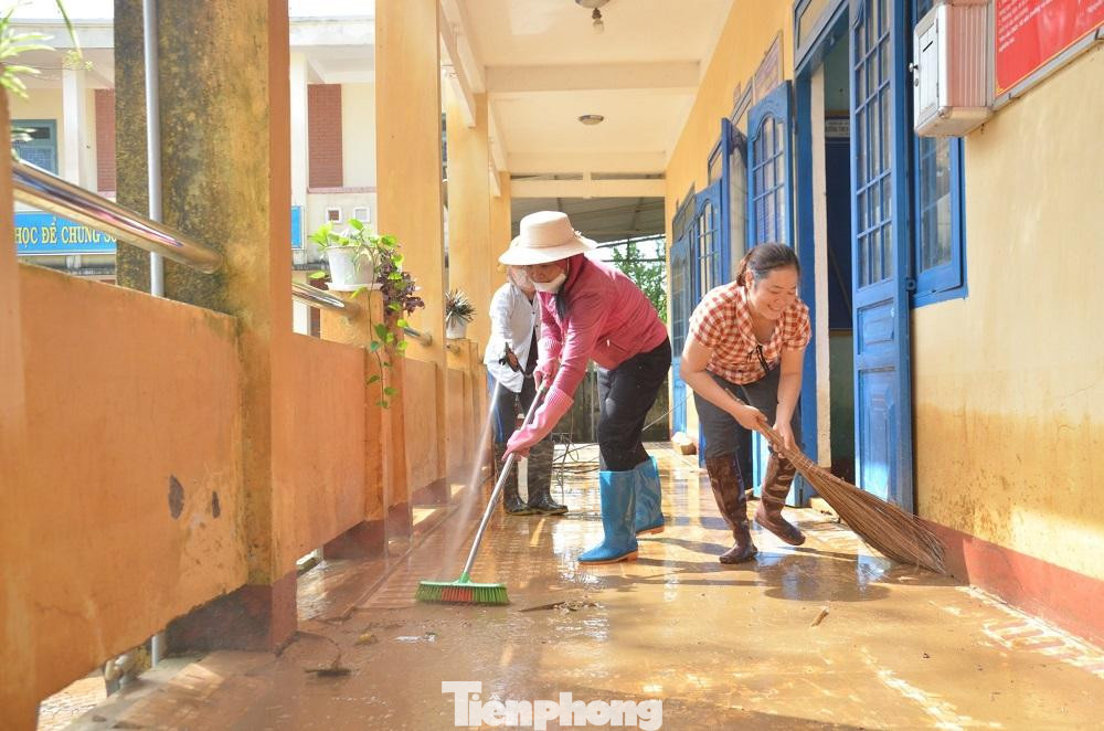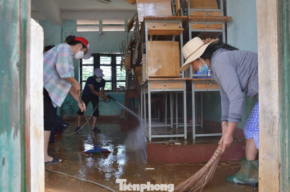 | Các giáo viên khẩn trương dọn dẹp bùn đất sau lũ. |