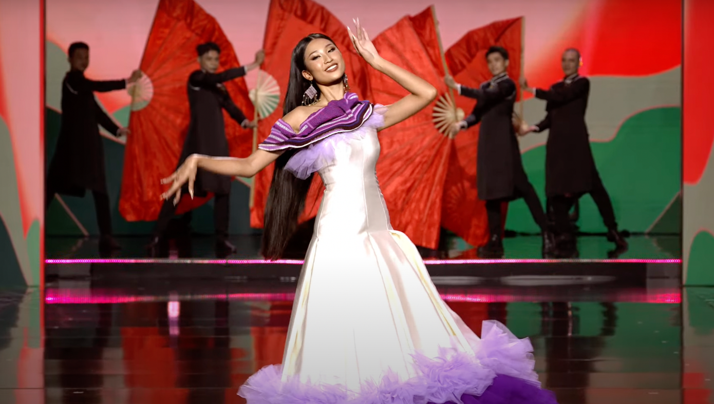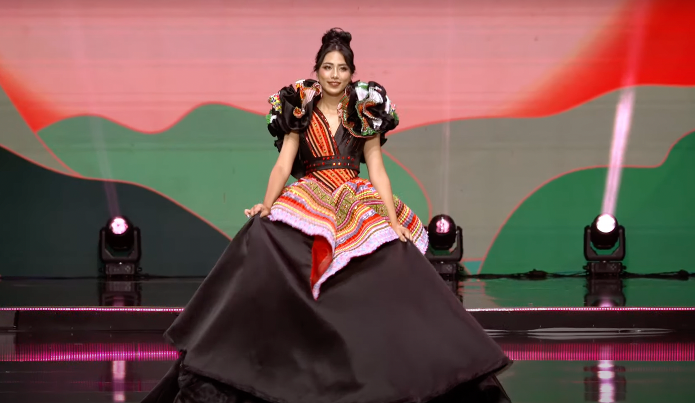 Top 18 bước vào phần thi đầu tiên trong đêm chung kết. Các thí sinh trình diễn những bộ trang phục lấy cảm hứng từ văn hoá Tây Bắc, dân gian với hoạ tiết thổ cẩm rực rỡ, bắt mắt.