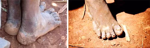 Ở những vùng nông thôn nghèo, nơi điều kiện sinh hoạt vệ sinh không đảm bảo, hầu hết các nạn nhân được phát hiện đều xuất hiện các tổn thương ở bên dưới bàn chân, thường là ở lòng bàn chân, bên dưới các kẽ ngón chân và xung quanh đầu ngón chân nơi tiếp xúc với đất bẩn nhiều nhất.